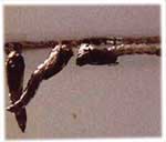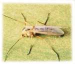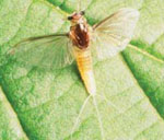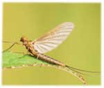 Caenis [commonly known as Angler's Curse] (Ephemeroptera). Small ephemerid species closely related to Olives. Two species in Orkney - one with a black abdomen and one with a creamy-white abdomen. The latter most common. Massive hatches on most lochs even Sin mud deposits in deepish water. Nymphs crawl on the bottom waiting to hatch. Hatch mid-Summer until lateAugust, generally in calm, mild weather. Fish eat all stages of insect, but probably take the dead spinner most often. Hard to replicate and trout will feed on little else when hatches are on. Patterns: Shipman's Buzzer in various colours and Hare's Ear dries, but accurate casting most important