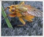 Cow Dung Fly (Diptera). Our most important terrestrial. Males larger & golden olive, females smaller & greyish olive green. Males out & about throughout fishing season, females proliferate in late summer. The quantity of females hatching in a short period of time makes the trout very interested in them, but trout will pick off the males in the early season when they get a chance (good areas for this are Kirkness & Tenston). The adults sit very high on the water and are, occasionally, very hard to imitate as they drift across the surface in front of the breeze. Patterns: Hedgehogs, Palmers, Hoppers, Hare's Ear patterns, Palmered March Brown, Muddlers, Dry Flies assorted.